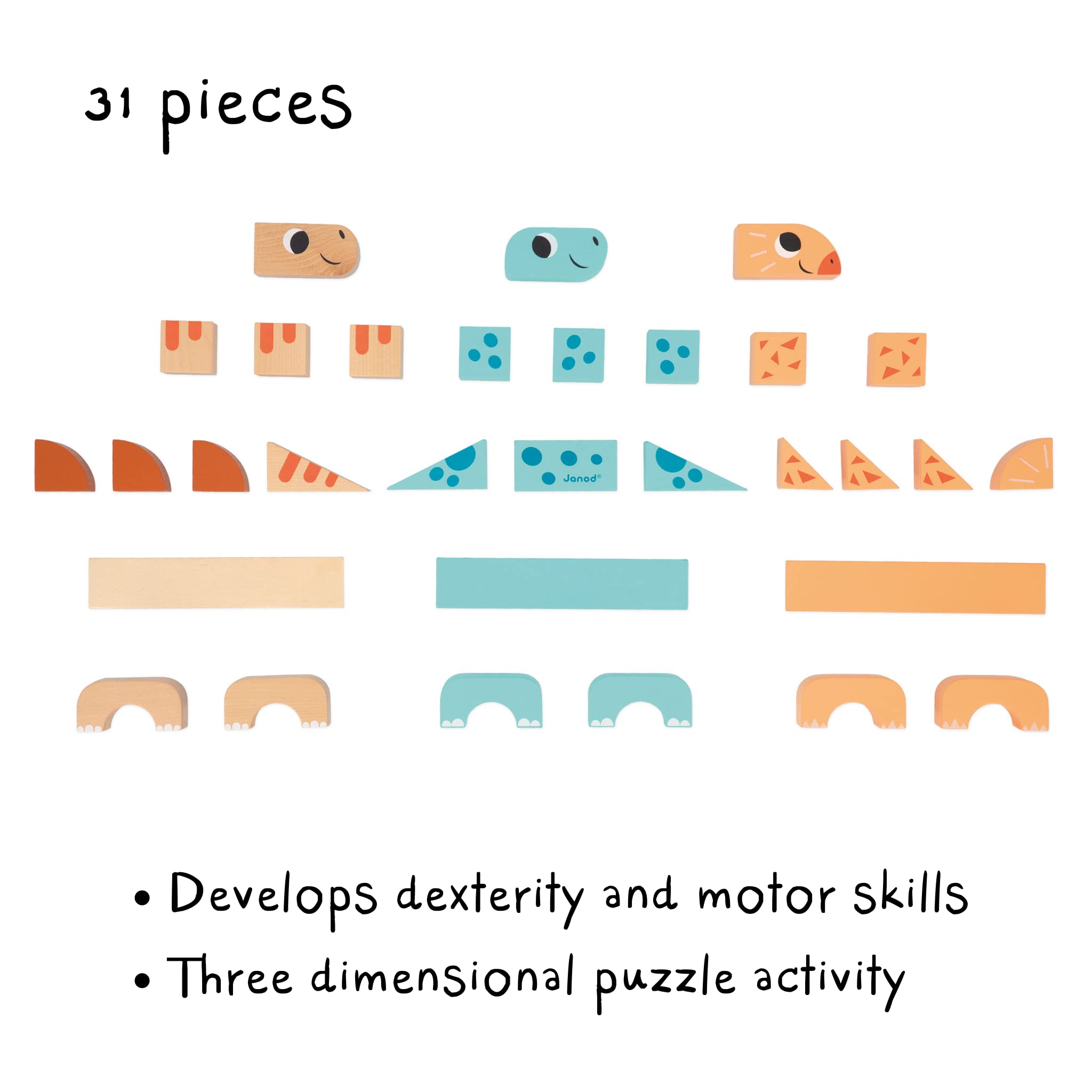 Janod Dino - 31 Piece Wood Dinosaur Stacking Blocks - Assemble 3 Cute Dinos - Ages 2-5 Years - J05833