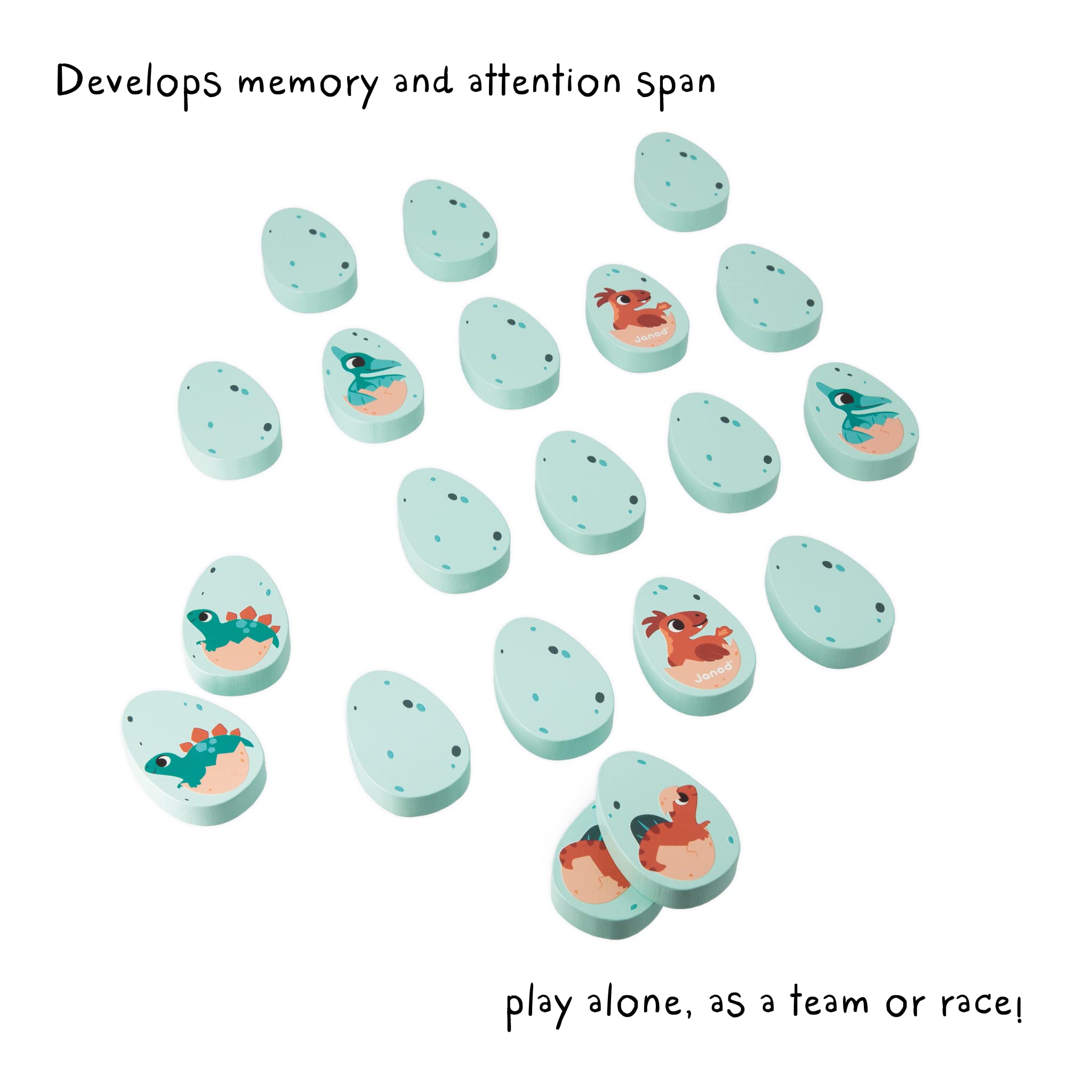 Janod Dino - Dinosaur Memory Game - 20 Wooden Dino Eggs with 10 Prehistoric Pairs - Cooperative or Competitive Early Learning Game - Ages 2-5 Years - J05826